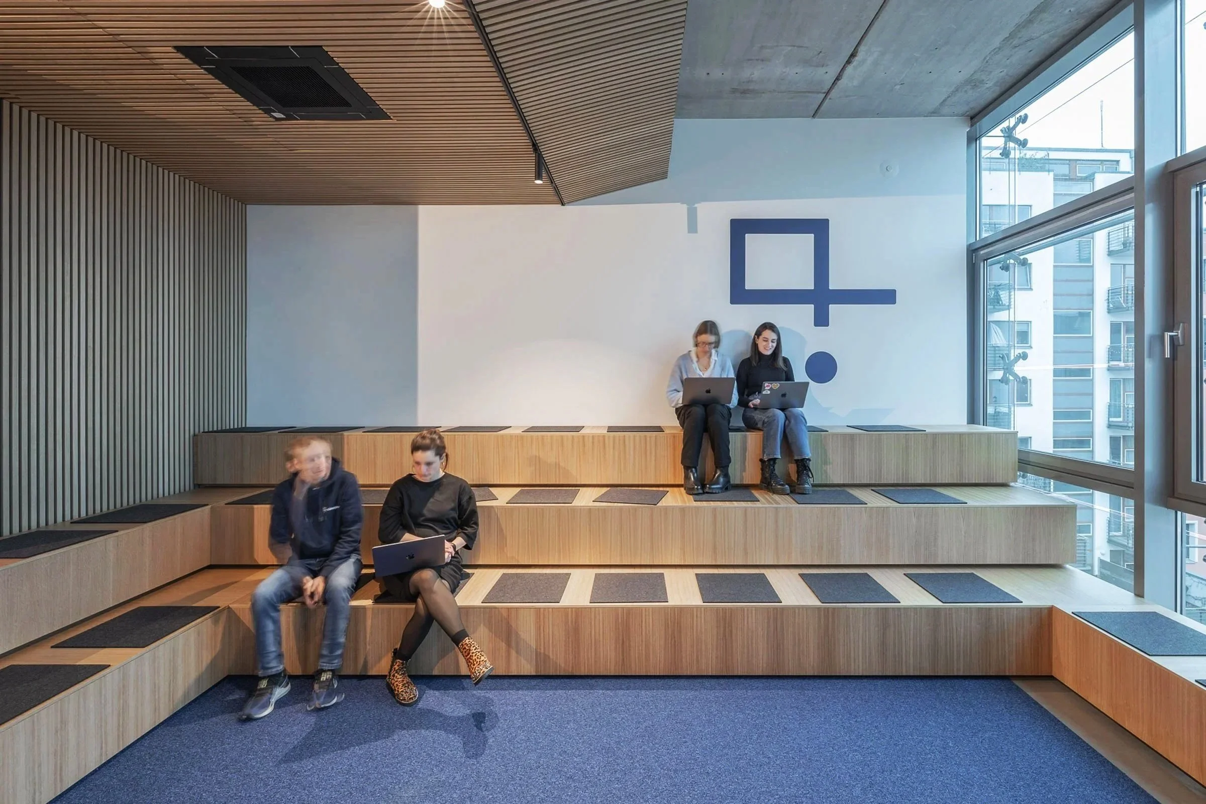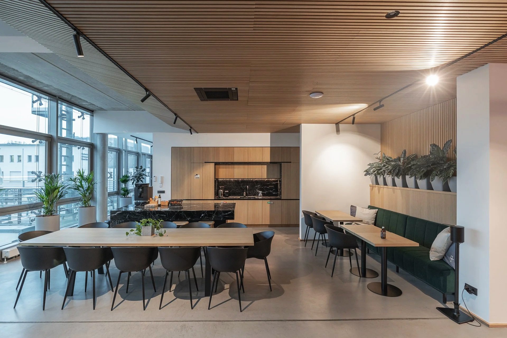 A generous kitchen and a new tiered gathering space became the social heart. This is where weekly talks, shared meals and team moments naturally gather. Around it, focused work zones and quiet corners support deep thinking and steady concentration. The layout encourages connection without noise and creativity without chaos.